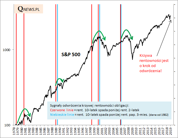 Od odwrócenia krzywej (rozumianego jako spadek spreadu 10y-2y lub 10y-3m poniżej zera) po raz pierwszy w danym cyklu mijało 16-26 miesięcy (średnio 22,5) do ustanowienia szczytu hossy przez S&P 500.