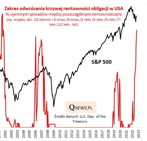 Jakie może być znaczenie inwersji dla inwestorów giełdowych? Na poniższym wykresie pokazujemy wskaźnik mierzący zakres (szerokość) odwrócenia krzywej w oparciu o wszystkie możliwe kombinacje spreadów między poszczególnymi obligacjami. Okazuje się, że na przestrzeni ostatniego ćwierćwiecza (za jakie dysponujemy kompletem danych potrzebnych do tych obliczeń) wzrost wskaźnika powyżej progu 70 proc. niezawodnie wieścił nadejście dwóch głębokich rynków niedźwiedzia na Wall Street.