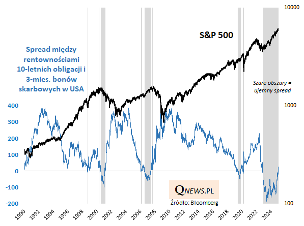 Jednocześnie jednak historyczne momenty wyjścia spreadu 10y-3m na plus po okresie głębokiego odwrócenia krzywej rentowności nie kojarzą się zbyt korzystnie inwestorom giełdowym. Takie sygnały miały miejsce w: