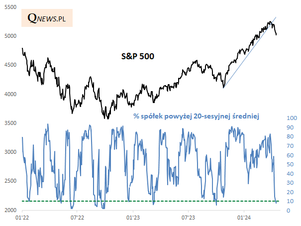 Innym wskaźnikiem, który znalazł się na naszych radarach, jest odsetek spółek z S&P 500 notowanych powyżej krótkoterminowej, 20-sesyjnej średniej kroczącej. Właśnie zszedł on poniżej progu 10 proc., wędrując najniżej od października ub.r. Wnioski są dość podobne, jak w przypadku McClellan Oscillator.