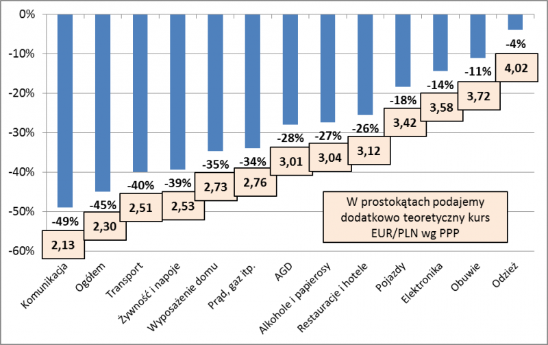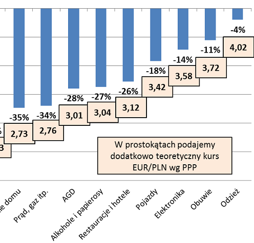 Gdyby nie uwzględnić tych kategorii, to okazuje się, że teoretyczny parytet powinien być dużo wyższy. Weźmy np. odzież, obuwie, elektronikę czy też pojazdy – w tych przypadkach poziom cen w Polsce jest już tylko nieznacznie niższy niż w całym Eurolandzie. A to właśnie te kategorie produktów wydają się kluczowe dla parytetu, bo dużo łatwiej je eksportować. Zagraniczny konsument na zakupy do Polski przyjedzie raczej po elektronikę, niż po to, by intensywnie korzystać z transportu publicznego.