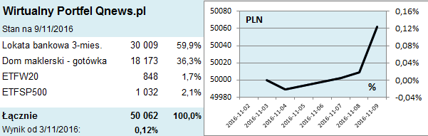 Zgodnie z zapowiedzią na środowym otwarciu dodaliśmy do "raczkującego" portfela jednostki ETFSP500, korzystając z paniki po wyborze D. Trumpa (12 sztuk x 82,04 zł + prowizja). Będziemy ciepliwie czekać na kolejne okazje.