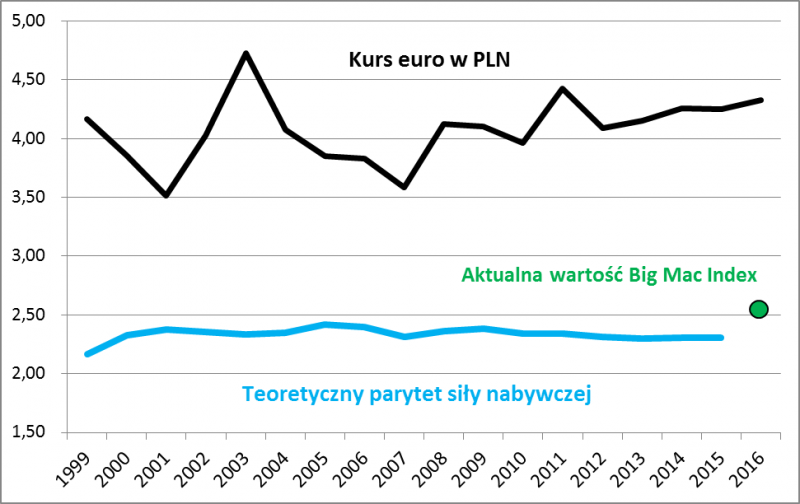 Zacznijmy od wersji bazowej. Według wyliczeń Eurostatu i OECD (obie organizacje współpracują ze sobą) parytet siły nabywczej na koniec 2015 r. wynosił zaledwie ok. 2,30 zł za euro. Innymi słowy, gdyby kurs EUR był na tym poziomie, obywatele strefy euro nie mieliby możliwości kupna tańszych polskich produktów i usług. Dane historyczne pokazują, że parytet od ok. 15 lat utrzymuje się stabilnie mniej więcej na tym samym poziomie.