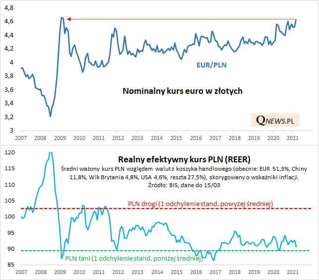 Reasumując, kurs euro - najważniejszej waluty w polskim koszyku handlowym - jest w okolicach wieloletnich maksimów względem PLN. Relatywnie wysoka inflacja w naszym kraju oddala jednak moment, w którym można by z czystym sumieniem powiedzieć, że PLN jest silnie niedowartościowany względem koszyka handlowego tak jak to było w latach 2009 lub 2016.