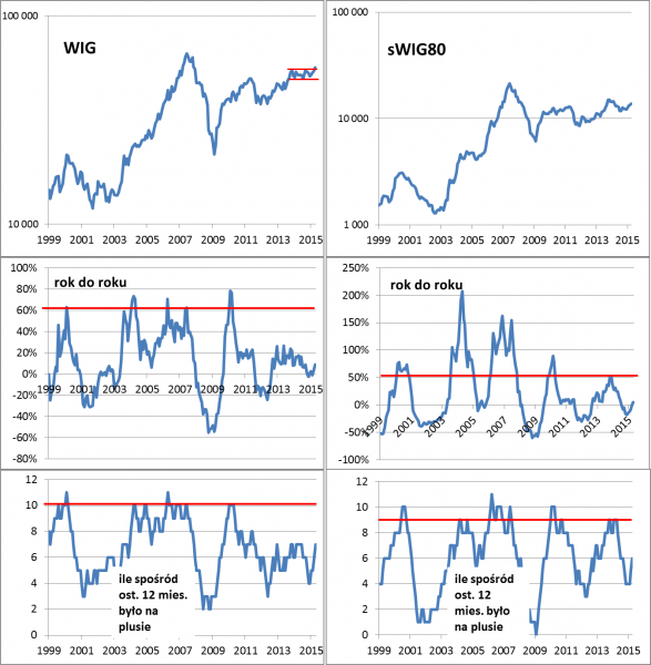 Jednym z nich jest roczna zmiana indeksów. W przeszłości obowiązywała tu prosta reguła: kiedy wskaźnik był bardzo wysoko, należało obawiać się przegrzania koniunktury. Dane dla poszczególnych indeksów nieco różnią się od siebie, ale można orientacyjnie przyjąć pułap 40-60 proc., jako taki, którego przekroczenie kazało poważnie zastanowić się nad przynajmniej częściową realizacją zysków z akcji. Oczywiście kryterium to nie jest obecnie spełnione – do takiego stanu rzeczy daleka droga w przypadku każdego z głównych indeksów. Przykładowo roczna zmiana sWIG80 dopiero co wyszła na plus (swoją drogą w przeszłości był to zawsze byczy sygnał).