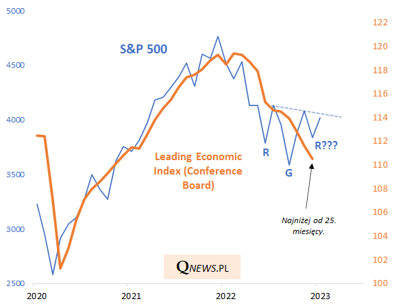 No dobrze, ale co to w praktyce oznacza dla inwestorów? Uwagę zwraca to, że podczas gdy LEI pozostaje w jednoznacznym trendzie spadkowym (właśnie znalazł się najniżej od 25 miesięcy), to giełdowy S&P 500 podejmuje coraz śmielsze próby odreagowania. Właśnie próbuje budować opisywaną już wcześniej "odwróconą głowę z ramionami" (oRGR), czyli formację, która wg podręczników analizy technicznej mogłaby oznaczać zmianę trendu na wzrostowy (pod warunkiem przebicia widocznej na wykresie "linii szyi").