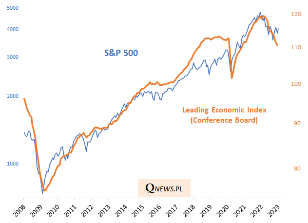 Najnowszy odczyt bacznie obserwowanego przez inwestorów amerykańskiego indeksu wyprzedzającego (LEI) Conference Board nie przestaje straszyć. Obecny spadek LEI, rozpoczęty wiosną 2022, jest najdłuższy i (nie licząc chwilowego tąpnięcia po wybuchu pandemii) najgłębszy od 2008 roku. Tak pokaźne spadki wskaźnika nie zdarzały się bez recesji na horyzoncie. “LEI ponownie mocno spadł w grudniu, podtrzymując sygnał nadejścia recesji w USA w bliskiej przyszłości" - komentuje Ataman Ozyildirim, Senior Director w instytucie Conference Board.