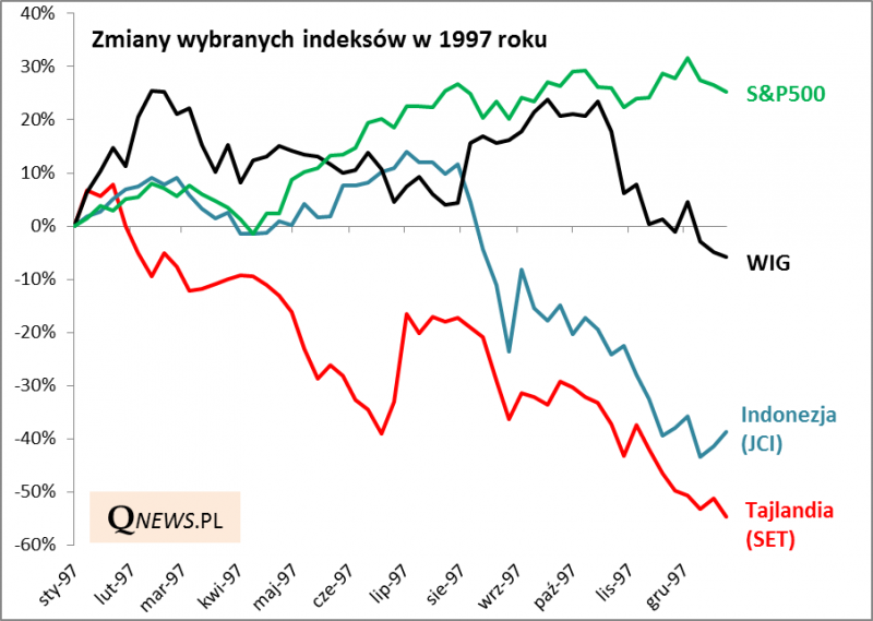 "Azjatycka grypa", jak określano szybko rozprzestrzeniający się kryzys, uderzyła w globalne rynki akcji, przede wszystkim rynki wschodzące. Nasz rodzimy WIG, który jeszcze we wrześniu był w okolicach 3,5-letniego maksimum, w październiku 1997 runął o 12%, a w listopadzie o kolejne prawie 7%.