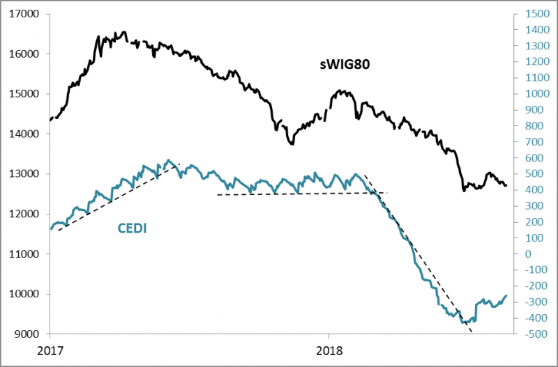 Teoretycznie powinien to być pozytywny sygnał dla polskich akcji, podobnie jak to było w poprzednich przypadkach (przełom 2014/2015, połowa 2016). Na razie jednak odbicie, szczególnie jeśli chodzi o kursy mniejszych spółek, przebiega opornie, na co wpływ mają inne czynniki takie jak umorzenia w polskich funduszach czy też "wpadki" wynikowe poszczególnych firm. Indeks sWIG80 balansuje tuż nad technicznym poziomem wsparcia.