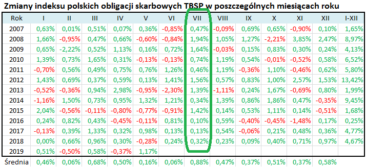 Kiedy spojrzymy na miesięczne stopy zwrotu z indeksu TBSP, okaże się że nadchodzący lipiec był historycznie jedynym miesiącem, w którym benchmark ZAWSZE był na plusie (jego historia sięga 2007 roku).