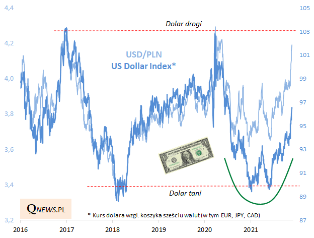 W tym rozumowaniu jest jednak tym razem jedno zasadnicze "ale" - tych wniosków nie potwierdza jeszcze zachowanie tzw. indeksu dolarowego, czyli globalnego miernika siły USD. W poprzednich latach wnioski z analizy USD/PLN i Dollar Index w zasadzie były jednakowe, ale obecnie widać, że indeks dolarowy nie zawędrował jeszcze równie wysoko jak kurs USD/PLN. Do wspomnianych szczytów z lat 2017 i 2020 brakuje w jego przypadku jeszcze prawie ok. 7% (dla porównania, od tegorocznego dołka kurs urósł do tej pory o ok. 8%). Innymi słowy, indeks dolarowy jest dopiero w połowie drogi od cyklicznych dołków do cyklicznych szczytów.