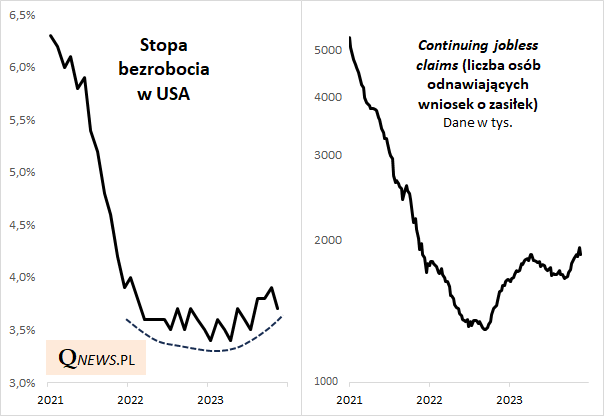 Upływający rok 2023 okazał się o tyle lepszy od wcześniejszych, powszechnie pesymistycznych oczekiwań, że nie przyniósł silnego wzrostu bezrobocia, utożsamianego często właśnie z recesją. Wskaźniki bezrobocia zaczęły faktycznie odbijać od dna, ale, wbrew obawom, nie jest to - przynajmniej na razie - silny wzrost, lecz raczej trend "pełzający". O ile jeszcze w październiku stopa bezrobocia wspięła się na 21-miesięczne maksimum, to w listopadzie cofnęła się do poziomu najniższego od lipca. Analogicznie, continuing jobless claims, czyli podawana co tydzień liczba osób odnawiających zasiłek dla bezrobotnych, właśnie cofnęła się poniżej pokonanego wcześniej kwietniowego szczytu.
