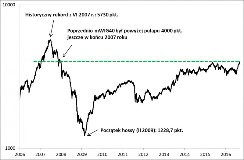 Oczywiście z prognozami różnie bywa, więc warto też przyglądać się alternatywnym miarom. Jedną z nich jest cena/wartość księgowa (P/BV). Z naszych obliczeń wynika, że obecnie mWIG40 notowany jest z P/BV na poziomie rzędu 1,70. Czy to dużo? Dla porównania, w okresie, gdy indeks poprzednio był na wysokości 4000 pkt., czyli w 2007 roku, wskaźnik ten przekraczał… 3,0.