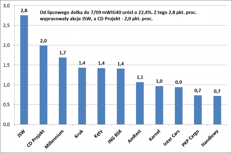 Rys. 2. Jakie spółki miały największy wkład do letniego wystrzału mWIG40 (dane w pkt. proc.)?