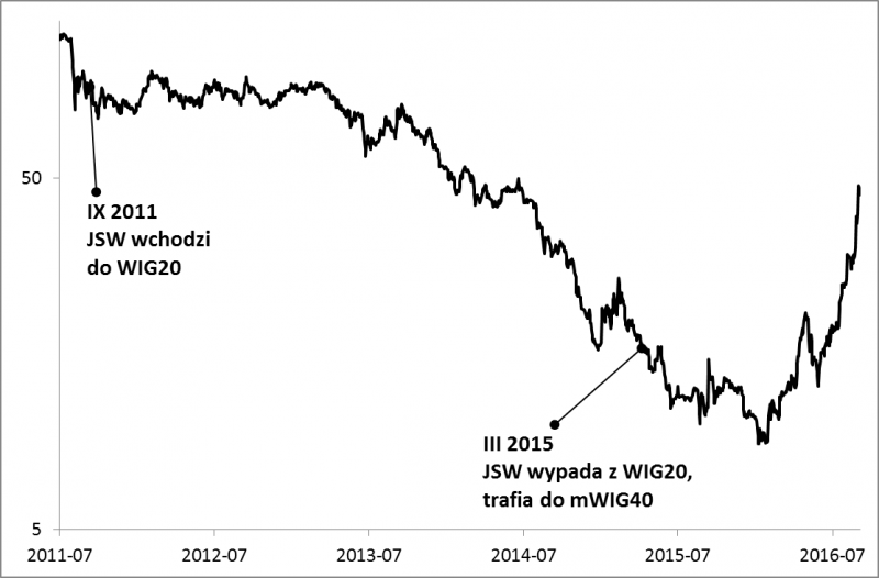Swoją drogą warto tu nawiązać do naszych badań na temat wpływu zmian w składzie WIG20 na stopy zwrotu. Dlaczego WIG20? Bo jeszcze nie tak dawno JSW była właśnie w tym elitarnym (przynajmniej w teorii) indeksie – została „wyrzucona” w ramach rewizji rocznej w marcu 2015 roku, po dwóch latach szokującej przeceny. Obecnie kurs jest już na poziomach dużo wyższych, niż w momencie tamtej degradacji. W świetle wspomnianych badań nie powinno to dziwić – jak zwracaliśmy uwagę, wśród spółek wykluczonych z WIG20 nierzadko znaleźć można było okazje inwestycyjne (tymczasem potencjał tych firm, które zasilały indeks, często się już wyczerpywał). Swoją drogą, skoro „odpadki” z WIG20 zwykle trafiają do mWIG40, a potem nierzadko „zmartwychwstają”, to być może jest to jedno z trwałych, strukturalnych wytłumaczeń dlaczego ten drugi indeks radzi sobie wyraźnie lepiej.
