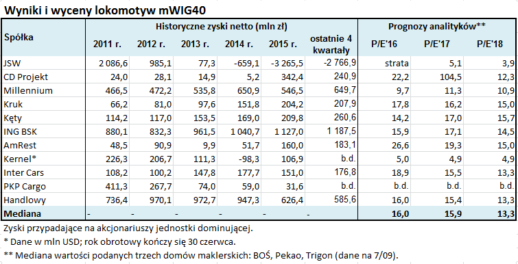 Nasuwa się jednak pytanie: czy po ostatnich zwyżkach akcje liderów „hossy średniaków” nie stały się zbyt drogie? W tabeli prezentujemy wskaźniki P/E (cena/zysk) bazujące na prognozach analityków na lata 2016-2018. Okazuje się, że ogólnie rzecz biorąc wskaźniki nie są już na niskich, atrakcyjnych poziomach, ale jednocześnie pułapy te nie są tak wysokie, by należało mówić o czymś w rodzaju bańki spekulacyjnej.