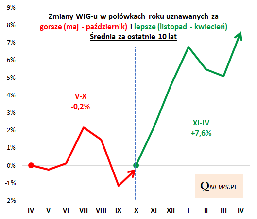 Bez względu na to, czy pod uwagę weźmiemy dane za ostatnie 10 czy 20 lat, statystyki wyraźnie pokazują, że okres od maja do października to rzeczywiście okres relatywnie słabszy dla WIG-u, zaś okres od listopada do końca kwietnia to "lepsza" połówka roku - przynajmniej jeśli chodzi o uśrednione wyliczenia.