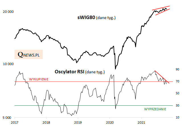 Jeśli już coś spada w przypadku indeksu małych spółek, to jest to monitorowany przez nas popularny wskaźnik zaczerpnięty z analizy technicznej, oscylator RSI (w wersji opartej na danych tygodniowych). Swój szczyt ustanowił on jeszcze w czerwcu i od tego czasu zachowuje się wyraźnie słabiej niż sam indeks, co oznacza, że powstaje rozległa "negatywna dywergencja". Wg książkowych schematów może to być pewien sygnał ostrzegawczy. Ale jest ciągle szansa na anulowanie owego sygnału, gdyby oscylator RSI przebił widoczną na wykresie czerwoną linię.
