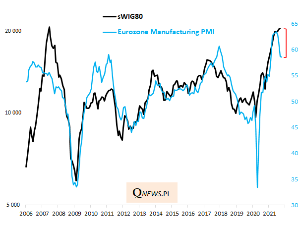 Poniższy wykres przypomina, że szczególnie akcje małych spółek na GPW były od lat mocno wrażliwe na wahania koniunktury w europejskiej gospodarce. Począwszy od lipca ta tradycyjna korelacja jak na razie nie jest jednak widoczna - sWIG80 "trzyma się mocno" jak na tak pokaźny spadek PMI ze szczytu. Czyżby tym razem rynek zakładał, że zadyszka w gospodarkach to jedynie chwilowe zjawisko?