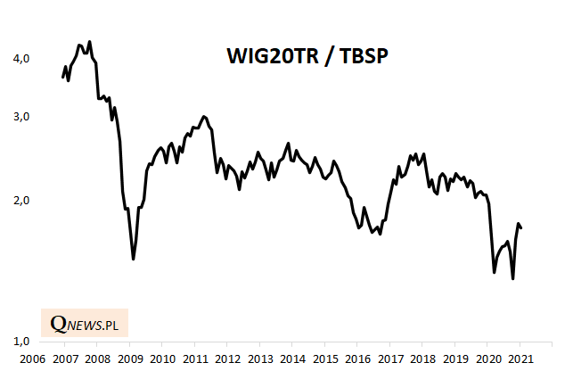 W przypadku flagowego WIG20 porównanie nie wypada zbyt imponująco, nawet jeśli pod uwagę brać wersję dochodową (total return) tego indeksu, czyli uwzględniającą reinwestycję dywidend. Od lat indeks blue chips przegrywa z obligacjami. W trakcie marcowego krachu tzw. siła relatywna WIG20 względem TBSP znalazła się rekordowo nisko. Trwające od tego czasu odbicie nie jest na tyle okazałe, by definitywnie odmienić długoterminowy krajobraz.