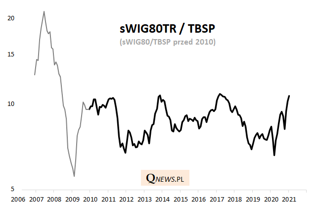Obecnie po kilkunastu miesiącach zwyżki współczynnik siły relatywnej sWIG80TR/TBSP znalazł się najwyżej od marca 2017, gdy poprzednia faza wzrostowa uległa wyczerpaniu. W tej okolicy dobiegały końca pokazy siły małych spółek również w latach 2013 oraz 2011. Z drugiej strony, kto zagwarantuje, że tym razem współczynnik siły relatywnej nie poszybuje w końcu wyraźnie wyżej, do poziomów widzianych jeszcze w latach 2007-2008? Obecnie byłoby to o tyle łatwiejsze, że rentowności obligacji są w okolicy historycznych minimów.