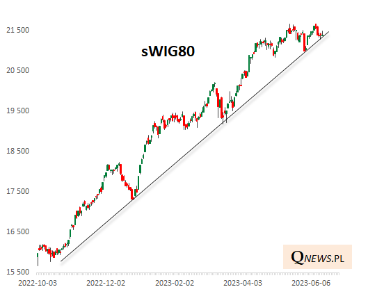Druga kwestia przykuwająca uwagę, dotyczy linii trendu wzrostowego, wzdłuż której sWIG80 porusza się w ramach wspinaczki trwającej od jesieni. Przydałoby się, by indeks utrzymał się powyżej owej linii, bo wg książkowych schematów ewentualne jej przebicie byłoby pierwszym sygnałem słabnięcia tendencji zwyżkowej. Podczas gdy historyczne maksima działają jako tzw. opór, to linia trendu (dopóki jest nienaruszona) działa dla odmiany jako wsparcie.