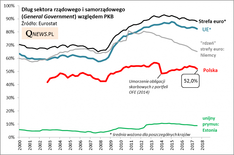 Dobra wiadomość jest taka, że w przypadku Polski zadłużenie "general government" (sektora rządowego i samorządowego) zmalało do 52,0% PKB. To nie tyle efekt tego, że polskie długi maleją, lecz raczej tego, że rosną ostatnio wolniej niż PKB. Najnowszy odczyt jest najniższy od sześciu kwartałów.