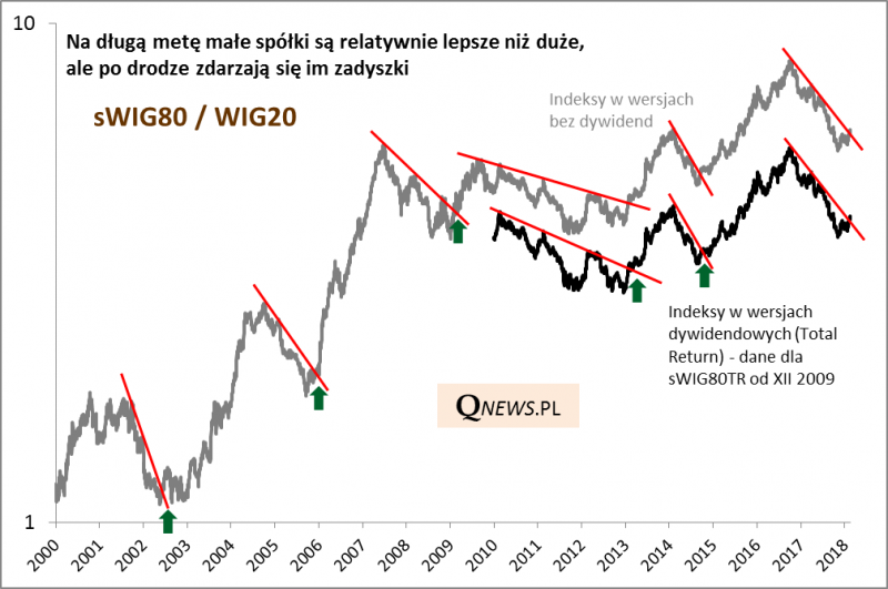 W perspektywie wielu lat akcje małych spółek zachowują się lepiej, niż dużych (WIG20). Nie jest to jednak jednostajne zjawisko. Po drodze zdarzają się przejściowe okresy słabości, takie jak w ubiegłym roku. Jednocześnie warto zwrócić uwagę, że te po takich okresach zdarzały się najlepsze okazje do cieplejszego spojrzenia na "maluchy".