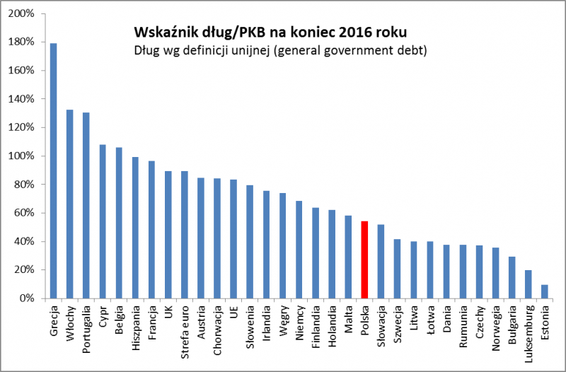 Zacznijmy od naszego kraju. Jako pozytywny odczytywać należy fakt, że Polska nie należy do najbardziej zadłużonych państw Unii i musiałoby się sporo wydarzyć, by ten stan rzeczy uległ zmianie. Na koniec IV kw. 2016 podawane przez Eurostat zadłużenie polskiego sektora rządowego i samorządowego (general government) stanowiło 54,3 proc. PKB. Dla porównania, unijna średnia (ważona wielkością gospodarek), to ciągle aż 83,6 proc. PKB. W strefie euro jest jeszcze gorzej – średnio 89,3 proc. PKB.