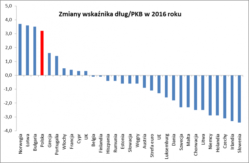 Rys. 2. Większość krajów UE redukowała dług w 2016 r., a Polska – szybko się zadłużała