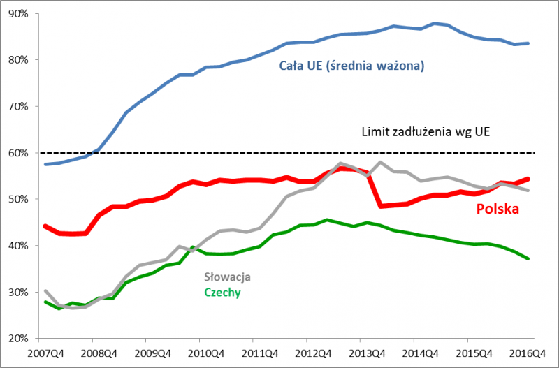 Można pokusić się o prostą symulację. Co by było, gdyby wskaźnik nadal rósł w takim tempie, jak w latach 2014-2016? Zwykła ekstrapolacja tego trendu pokazuje, że gdzieś pod koniec 2019 roku osiągnąłby on pułap 60 proc. PKB. A tymczasem trwałe przekroczenie tej granicy może zgodnie z unijnymi traktatami skutkować nałożeniem tzw. procedury nadmiernego deficytu (EDP), według której dany kraj powinien zacząć systematycznie redukować deficyt budżetowy i dług. Można szacować, że w praktyce ten pułap zostałby osiągnięty mniej więcej rok później (2020/2021) dzięki zapowiadanemu kolejnemu „odchudzeniu” OFE o ok. 35 mld zł (ta kwestia będzie się rozstrzygała w najbliższych miesiącach). Inna sprawa, że unijne procedury historycznie były raczej mało skuteczne, skoro w wielu krajach UE wskaźniki długu bujają w obłokach.