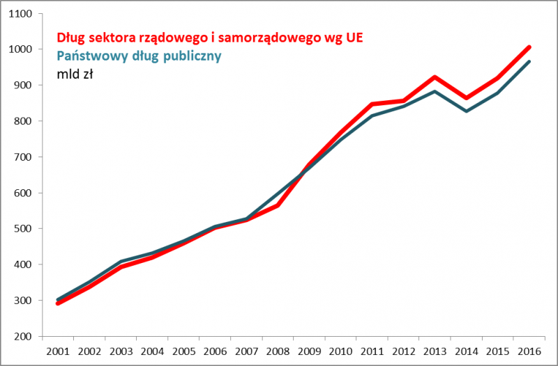 Łatwo pogubić się, czytając informacje na temat stanu zadłużenia naszego kraju. Wszystko dlatego, że jest ono definiowane na różne, niekoniecznie kompatybilne sposoby. Zarówno polska konstytucja (art. 216), jak i unijne traktaty nakładają limit dla długu na poziomie 60 proc. PKB, ale w każdym przypadki dług jest definiowany inaczej. W konstytucji chodzi o tzw. państwowy dług publiczny (PDP). Na koniec 2016 r. wg danych Ministerstwa Finansów PDP wyniósł 965,2 mld zł, co stanowiło 52,1 proc. PKB. Tymczasem dług definiowany przez UE jako zadłużenie sektora instytucji rządowych i samorządowych (general government) to pojęcie szersze. Na koniec 2016 r. wyniósł 1.006,3 mld zł (po raz pierwszy w historii przekroczony został pułap 1 biliona zł). Nawet według tej drugiej definicji dług nie obejmuje trudnego do jednoznacznego obliczenia tzw. zadłużenia ukrytego, czyli np. zobowiązań państwa względem przyszłych emerytów.