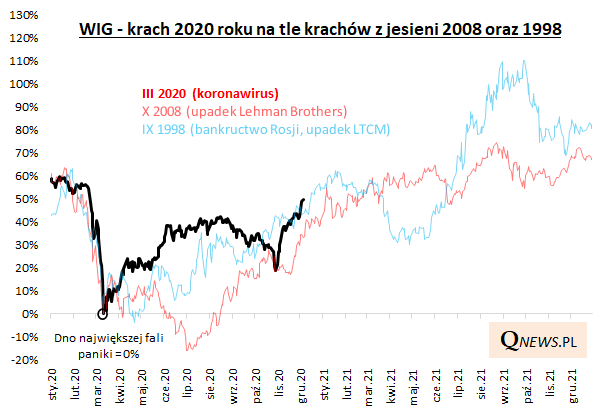 - po pierwsze widać, że nasze porównanie, choć na początku kwietnia mogło się wydawać abstrakcyjnie optymistyczne, ostatecznie okazało się bardzo trafnym drogowskazem na kończący się 2020 rok, bo WIG wychodzi z krachu mniej więcej zgodnie z historycznymi wzorcami;