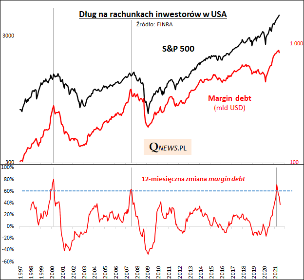 Można się zgodzić, że postępujące schłodzenie margin debt może z wyprzedzeniem wróżyć pierwszą od miesięcy większą korektę na Wall Street. Ale to powinna chyba być tylko korekta, a nie bessa na wzór tych z lat 2000-02 czy 2008, bo brakuje czynnika, który wtedy doprowadził do głębokiego załamania zarówno poziomu długu jak i samych cen akcji, czyli serii podwyżek stóp procentowych w USA. Na razie Fed zastanawia się nad ograniczeniem gigantycznego skupu aktywów (QE), który to swoją drogą dzięki zapewnieniu niespotykanej płynności w systemie finansowym sprzyjał wywindowaniu margin debt do rekordowych pułapów.