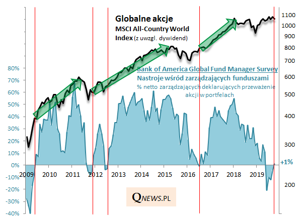 Co taka zmiana nastawienia oznaczała historycznie? Bazując na danych od 2009 roku - był to niezawodny sygnał ... kupna akcji. Oznaczał, że nastroje funduszy zaczynają się zdecydowanie ocieplać, a zarazem że jest to dopiero początek tego wielomiesięcznego procesu.