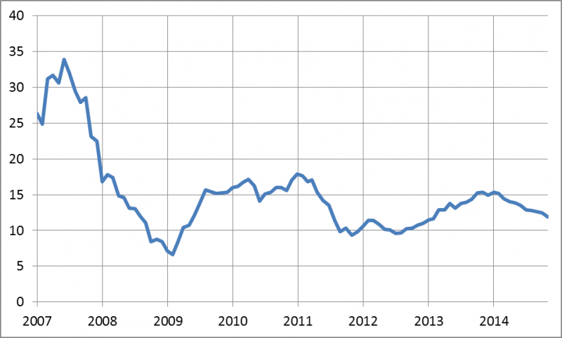 W tym roku mamy do czynienia ze specyficzną sytuacją na polskim rynku finansowym. Z jednej strony obserwujemy systematyczny spadek rentowności obligacji skarbowych. Z drugiej – przez większość roku spadały też wyceny większości akcji na warszawskim parkiecie. Obliczana przez nas mediana wskaźników P/E (cena/zysk) dla wszystkich spółek z GPW spadła z ponad 15,0 do poniżej 12,0.