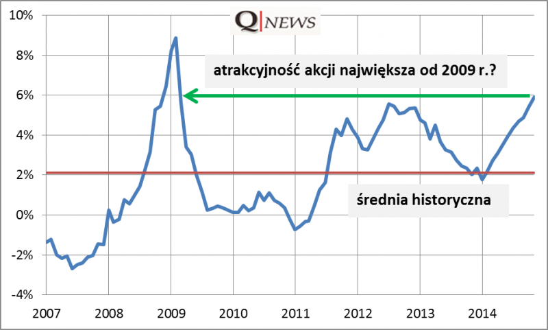 Obecna teoretyczna atrakcyjność akcji jest też wyraźnie wyższa od historycznej średniej. Od 2007 r. EY był średnio o ok. 2 pkt. proc. wyższy od rentowności obligacji – to zrozumiała premia za ryzyko związane z inwestowaniem w akcje. Teraz ta premia jest dużo wyższa od średniej.