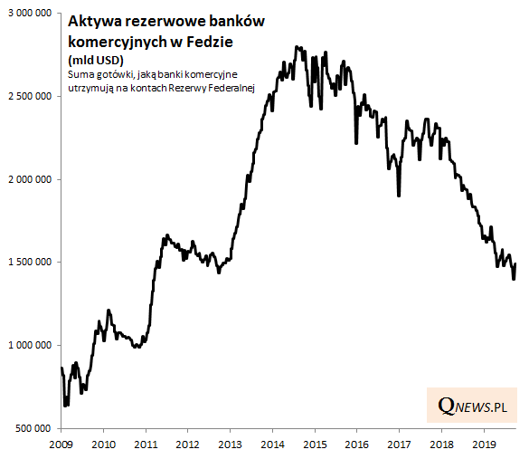 Chociaż do październikowego posiedzenia amerykańskiego Fedu pozostały jeszcze ponad dwa tygodnie, to ostatnie dni (i tygodnie) przynoszą ważne sygnały od banku centralnego. Zawirowania na rynku pożyczek międzybankowych (wrześniowy wystrzał ich oprocentowania) obnażyły niedostatki płynności, które zdaniem niektórych analityków były efektem wcześniejszego nadmiernego "zaciskania pasa" w postaci QT (quantitative tightening, czyli zacieśnianie ilościowe = redukowanie portfela obligacji skarbowych skupionych wcześniej w ramach QE). Wskazują na drastyczne skurczenie się tzw. aktywów rezerwowych trzymanych przez banki na kontach w Fedzie.