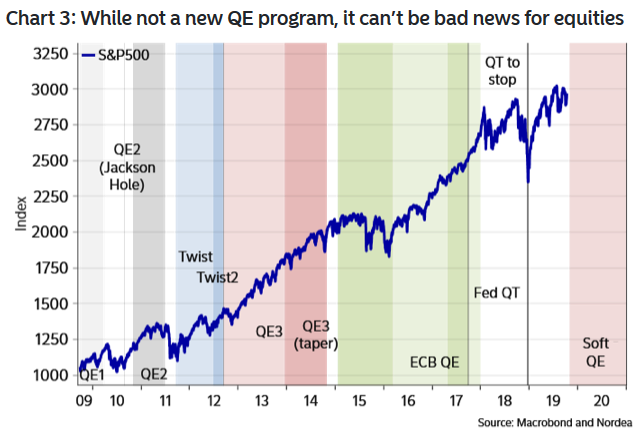 Stratedzy Nordea Banku określają zapowiedziane działania jako "soft QE" (miękkie QE) i sugerują, że chociaż nie muszą stanowić one silnego pozytywnego impulsu dla rynków akcji, to "nie mogą być złą wiadomością dla akcji". Zwróćmy uwagę, że ostatnie kilkanaście miesięcy, w trakcie których nastawienie Fedu było jastrzębie (QT), przyniosło silne turbulencje na giełdach.