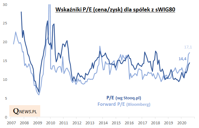 Wskaźniki P/E z poziomów niskich lub nawet bardzo niskich, wspięły się wyraźnie wyżej. W wersji opartej na raportowanych zyskach współczynnik ten zrównał się ze swą historyczną średnią, zaś w wersji opartej na prognozach analityków (forward P/E) jest już nawet powyżej analogicznej średniej.