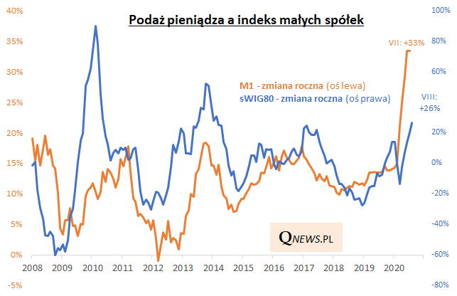 Zerknijmy też na podaż pieniądza, która do tej pory mocno "pompowała" kursy małych firm. Wg najświeższych, opublikowanych wczoraj danych, w lipcu roczny wzrost agregatu M1 ustabilizował się na (ciągle bardzo wysokim) poziomie 33%. Z historycznego punktu widzenia kluczowym zagrożeniem byłoby jednoznaczne "zakręcenie" dynamiki podaży pieniądza w dół - na razie jednak z takim sygnałem nie mamy do czynienia.