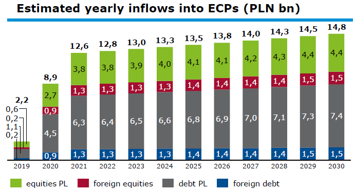 Największa porcja z tego strumienia składek zostanie zainwestowana w polskie instrumenty dłużne (głównie obligacje, w tym skarbowe), ale pokaźna część ma trafić też na rodzimy rynek akcji - 0,6 mld zł w tym roku, 2,7 mld zł w 2020, 3,8 mld zł w 2021.