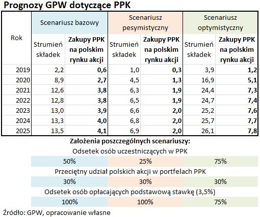 GPW szacuje, że w bazowym scenariuszu napływy składek do PPK osiągną 2,2 mld zł w tym roku, 8,9 mld zł w następnym oraz ponad 12 mld zł w 2021, po czym będą już bardziej stopniowo rosnąć.