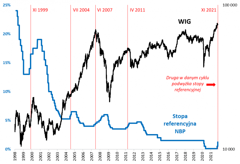 Zacznijmy od naszego lokalnego podwórka. Już przed miesiącem analizowaliśmy dokładnie historyczne zachowanie WIG-u po rozpoczęciu podwyżek stóp. Teraz czas na aktualizację tych rozważań. Sygnał, któremu przyjrzeliśmy się w październiku – czyli pierwsza podwyżka stopy referencyjnej – ustępuje miejsca nowszemu sygnałowi, czyli drugiej podwyżce.