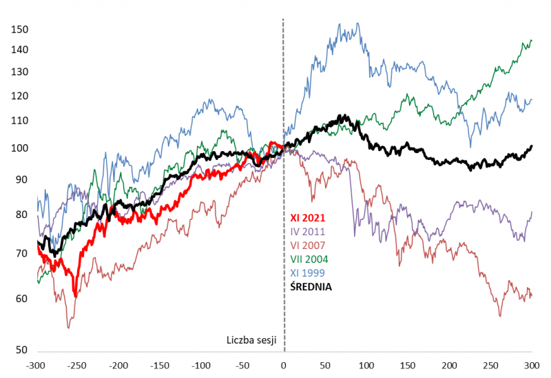 Warto w tym miejscu jeszcze dodać, że pojawienie się trzeciej w cyklu podwyżki stóp (która według oczekiwań rynkowych możliwa jest już w grudniu) przesunęłoby analizowane historyczne ścieżki w kierunku bardziej niedźwiedzim. Przede wszystkim za sprawą wspomnianego nietypowego przypadku z lat 1999/2000 – wtedy druga podwyżka (XI 1999) miała miejsce na ok. cztery miesiące przed końcem hossy, zaś trzecia (II 2000) – już praktycznie w okolicach szczytu trendu zwyżkowego na GPW (który ukształtował się na niewiele wyższym poziomie w III 2000).