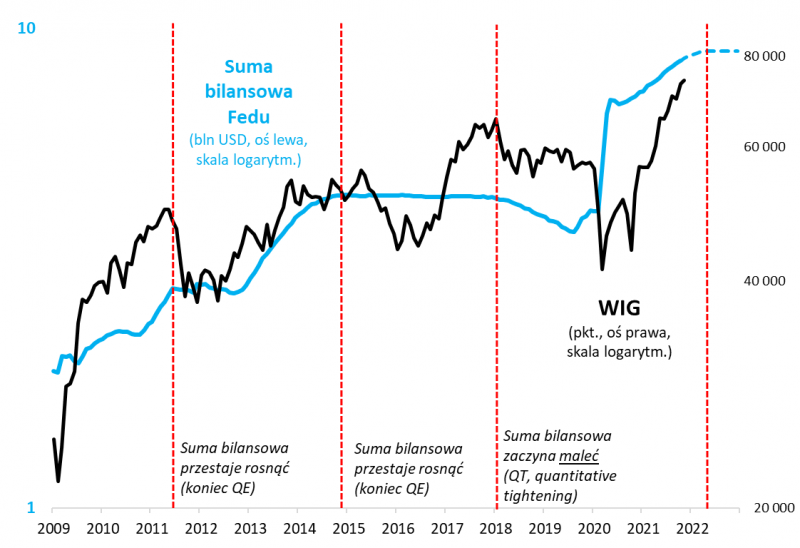 Nie powiedzielibyśmy, że więź łącząca nasz krajowy rynek akcji z bilansem Fedu jest perfekcyjna, ale trudno też dyskutować, że zupełnie nie istnieje. Owszem, zdarzało się, że WIG bywał okresowo niezależny od sygnałów zza oceanu – najbardziej rzucający się w oczy przykład to hossa 2017 roku przy stabilnej sumie bilansowej. Ale z drugiej strony można wskazać dużo więcej przykładów potwierdzających więź. Silna hossa panująca na GPW (z przerwą na przejściową słabość na jesieni 2020) od czasu wytoczenia przez Fed najcięższych armat po wybuchu pandemii dobrze wpisuje się w schemat znany z poprzednich rund QE.