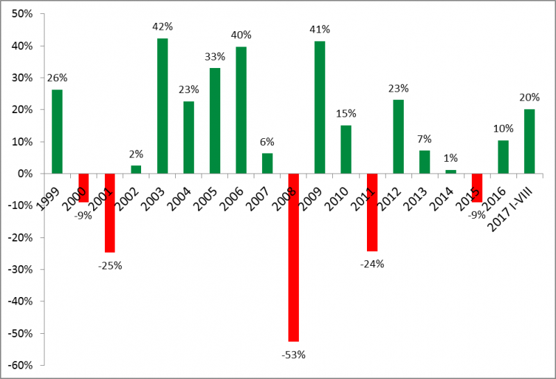 Sięgnęliśmy maksymalnie daleko w przeszłość (dane GUS nt. indeksu inflacji dostępne są od XII 1998). Na wykresie pokazujemy ile wynosiły realne zmiany WIG-u w poszczególnych latach.