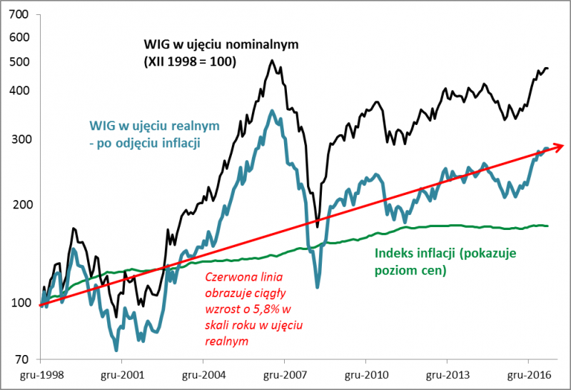 Rys. 3. WIG nominalnie i po skorygowaniu o inflację