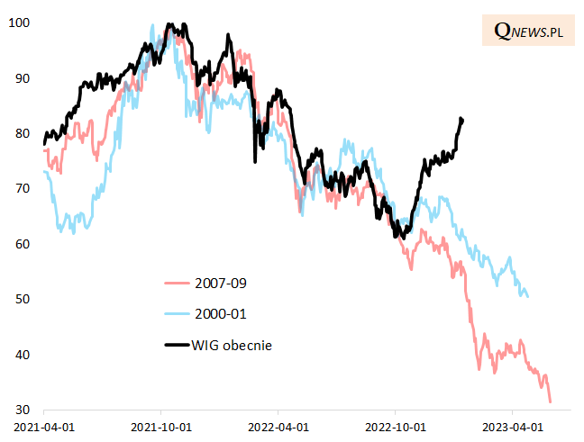 Skoro WIG zachowuje się niemal perfekcyjnie tak samo jak w latach 2001 czy 2020, to uprawnione jest sprawdzenie co wynikałoby z dalszego utrzymania tych analogii. Szybki rzut oka na wykresy pozwala od razu znaleźć wspólne mianowniki.