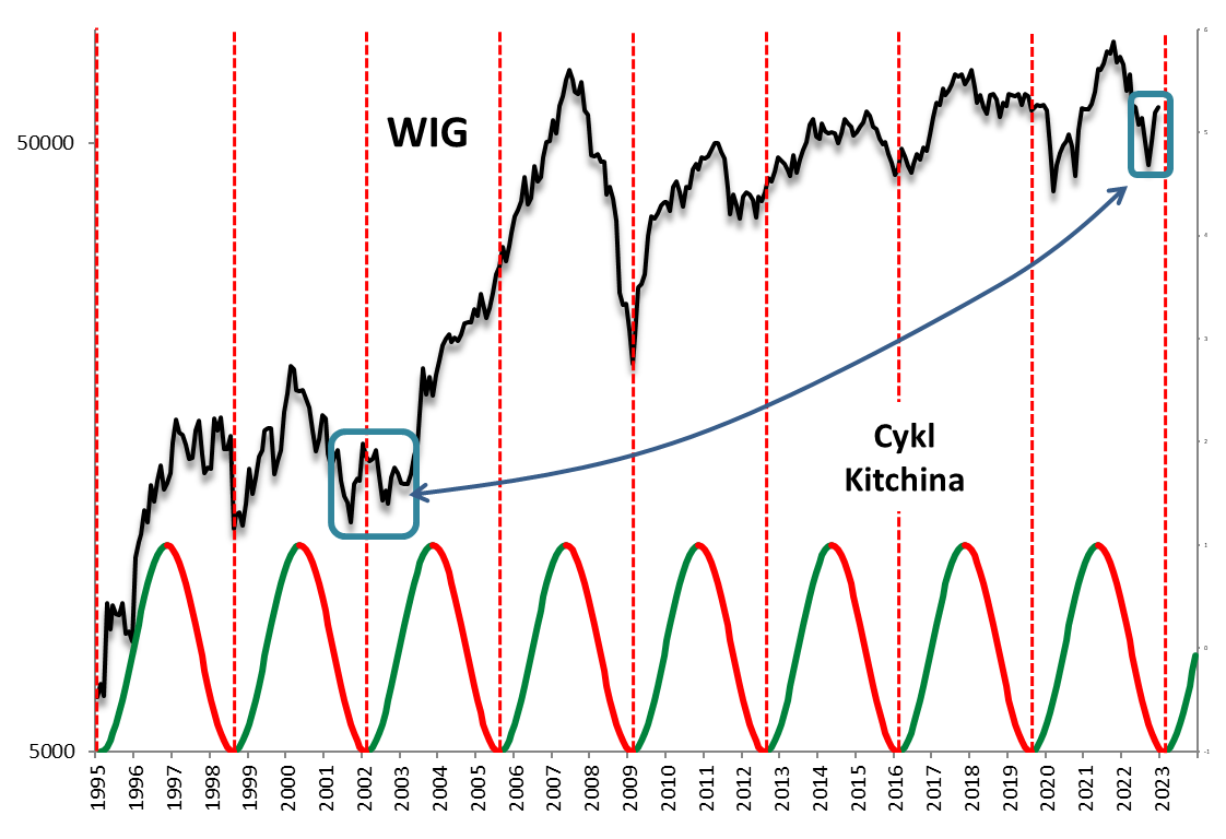 Jeden z omówionych historycznych wzorców – ten z 2001 roku – jest też interesujący przez pryzmat pojawiającego się w naszych analizach tzw. cyklu Kitchina. Przypomnijmy, że teoretycznie dołek tego cyklu powinien się pojawić na GPW dopiero w rozpoczynającym się I kwartale, a nie w IV kw. 2022, jak to miało miejsce. Mamy zatem do czynienia ze swoistym ruchem „wyprzedzającym”. Jeśli poszukamy podobnej historycznej sytuacji, to znów lądujemy właśnie w roku 2001. Także wtedy krajowy benchmark „za wcześnie” zaczął dynamicznie rosnąć, co później musiał okupić cofnięciem. Co ciekawe, wtórne dno bessy ukształtowało się z kolei już po teoretycznym dołku cyklu Kitchina. Czyżby i tym razem miało być podobnie?
